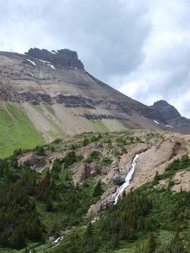 Instead of meeting him at the parking lot, I drove down to Calgary on Tuesday morning, and we would drive to Jasper together, just in case we decided to do a last minute change of objective. It was a scenic drive up Icefield Parkway, and we eventually started our trip at 7:40 pm. After loading our big packs, we hiked passing the warden station into the well-maintained Poboktan Trail. The approach was very boring, and for the first 6km, we pretty much couldn’t see anything except for the creek, and the trees. We did got some view looking back, but it was mostly cloudy. At 6km mark, we came to a signed junction, and we would pick the left branch going towards Maligne Pass. We continued hiking for about an hour up this trail, crossing the creek several times. By now the forecasted rain finally arrived. We had to make the correct call as where to leave the trail. The views weren’t too open and we weren’t very sure if we should head into the bush or not. Kevin did bring a GPS but for some reasons it didn’t work. Oh well, through the trees we could sort of see a broad valley, so the bushwhacking started.