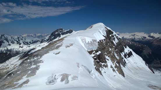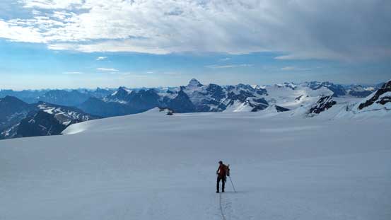 The ascent of Farbus was indeed technically easy, but far from ‘short’. We had to gain at least 200 meters of height and over a long distance. The summit just never seemed to get closer, and once it did get closer we had to ascend onto the summit glacial field, probing the cornice carefully. We still couldn’t ascend to the real apex due to the massive cornice but by wondering back and forth a bit we did manage to get most of the views. Looking back towards the 5 peaks on Mt. Lyell stole the show, while Mt. Alexandra was trying her best to compete towards north.