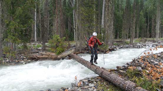 Vern au-cheval across the log bridge