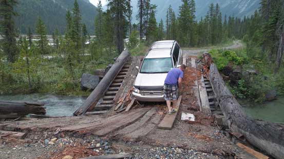 Now the exciting time began – the drive out. I think we all had huge concern that Ben’s SUV might not be able to make it out even though nobody spoke it out. Indeed we were facing some serious difficulties. The washed-out creek crossings weren’t too bad but the river/swamp crossing had become a death trap… The river was flowing very fast and it’s deep (more than door deep) and we couldn’t see the bottom. I had no idea how we made through. And now came the collapsed bridge. One of the planks got popped up and knocked off the bumper but other than that no major damage. Thankfully it didn’t hit other places otherwise we’d have huge problems.