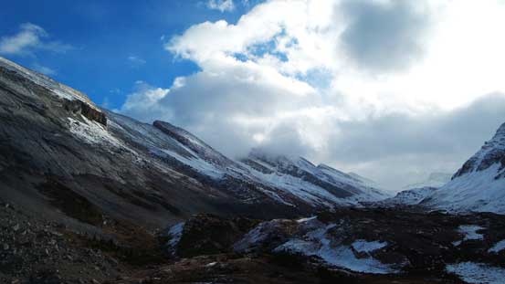 There was still more than 400 m height gain from where we ditched gears to the summit. It didn’t appear to be that long but having GPS units we knew the view was foreshortened. The weather was held pretty nicely so far for the front range and we were hoping for some really nice views from the top. There was one boulder field requiring some caution due to the fresh snow but other than that it was no more than easy scrambling. Oh by the way, there’s some confusion regarding where the true summit of Marble Mountain locates. The summit we ascended, also the one on bivouac.com is different than the official summit which is marked on the far north end of the long ridge (about 1.2 km further). From our observation as well as the contour lines on topo map the two ends on Marble Mountain’s long ridge have pretty much the same height. The direct traverse didn’t look straightforward but if you just ‘have to’ bag the official highpoint then I believe it’s an easy ascent from its east slope directly from South Boundary Trail, or via the north slopes from Brazeau Lake. I’d treat either of the two as ‘legitimate’, depends on where you start the ascend.