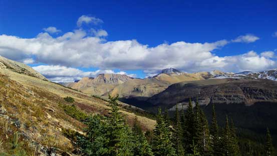 We initially stayed relatively close to the creek but the thick bush forced us to ascend more towards climber’s right. We didn’t pay enough attention to where we headed exactly so before we realized we were already way up high on Marble Mountain’s slope, high above the ascending drainage and pretty close to treeline. This wasn’t our intention but turned out to be a very good route choice. Once exiting the trees we’d contour a long ways around Marble Mountain’s SE and then S slopes before ditching our backpacks for a summit bid. There were some ugly terrain to negotiate on this long side-hill traverse including some krumholtz and steep and loose scree, but still better than the dense bush by the creek (as we discovered on return). The down-side of our route was the lack of water source. We did not fill up our water bottles before leaving the creek, but oh well, there was some snow higher on the mountain so we’d be fine.