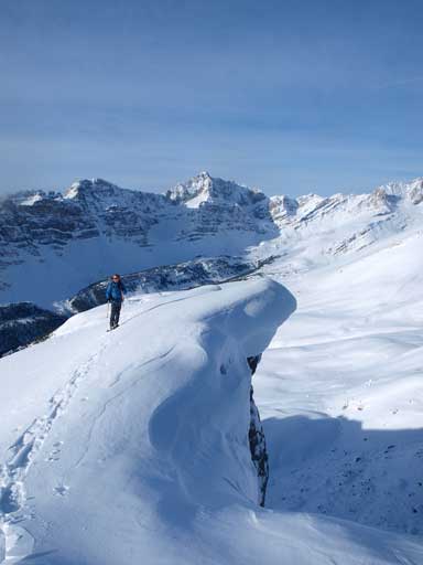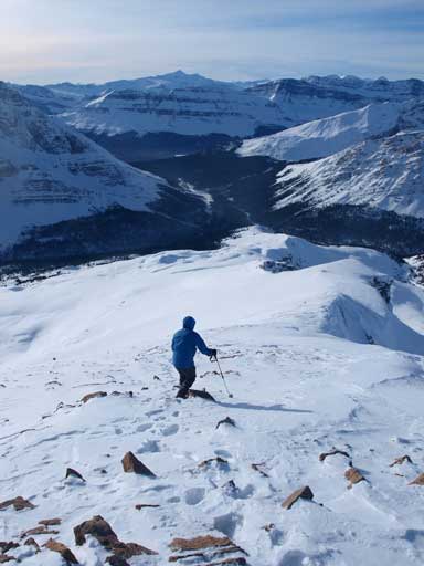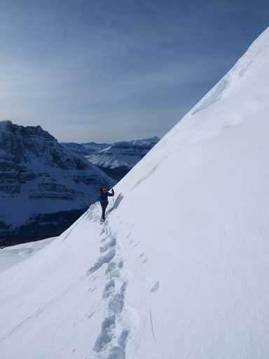 The slope was very foreshortened. It took us a long time to traverse to the left hand side ridge. We then followed the ridge up until it narrowed down to a shear drop-off, and then there came the crux. Under the snowy condition, the down-climb looked very involved than just “moderate scramble”.. I would go for it if that’s a must, but given the stable snow condition, we decided to by-pass it on skier’s right. The by-pass was very steep for about 5 meters but got better afterwards. The slope was probably above 40 degrees for a short while and it felt pretty exposed.