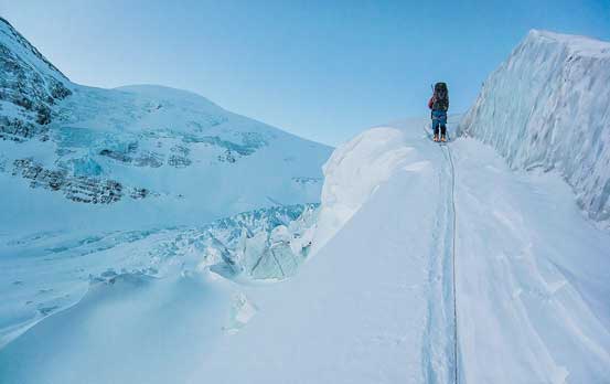 Me skinning towards the first icefall at dawn. Photo by Ben
