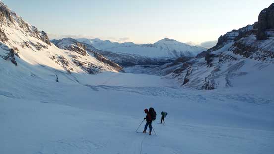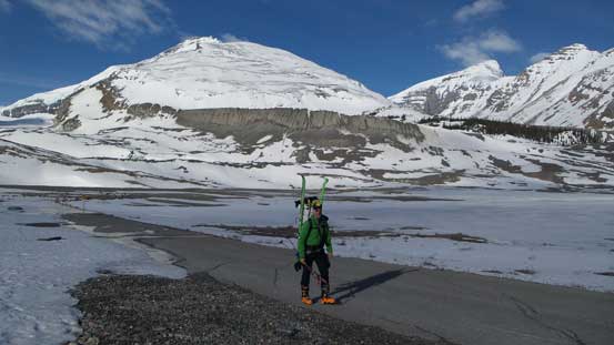 The rest of the skiing down the 1st icefall and then the main Athabasca Glacier was crusty but still, very fast. I didn’t time ourselves but it did seem like it didn’t take us much time at all in descending. Reascending from the toe back to the parking lot was no fun by comparison as we had to carry skis and slog up either on moraine or on road…