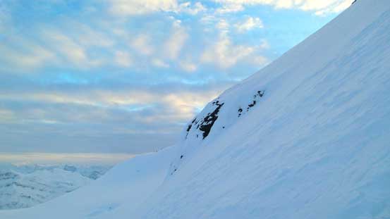 The East face did not look nearly as steep as from afar, but still, it’s a steep snow climb. It’s also a long one (500 vertical meters) with literally no break. At this time of a day with over 20 km distance of skiing (and carrying winter overnight mountaineering loads) we were all very fatigued and tired. Thankfully once the snow climb started my energy kicked-in as usual so we didn’t really slow down by much. Despite the lateness of the day, the snow condition was just perfect with only occasional post-holing and mostly step-kicking. The slope angle did get steep near a rock feature (about halfway up) to 40-45 degrees. After that section the slope angle eased a little bit but it was still no-fall zone. At about 100 vertical meters below the summit I discovered a crevasse and stepped over it somehow. Ben wasn’t nearly as lucky and fell through, but thankfully both Vern and I kept the rope very tight so he wasn’t going anywhere. He managed to free himself out and we continued upwards and onwards. I then led a line diagonally up climber’s left breaking through the summit roof on some deep loose snow, and soon enough, the summit was right in front of us. Yes we made it.. Unfortunately the summit was cold and windy like hell, plus the fact it was already past 7:30 pm so we didn’t linger any longer than necessary before starting the descent.
