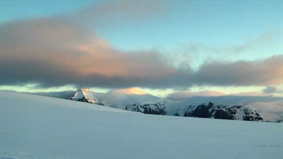 Gorgeous sunrise over Mt. Andromeda. Note the snowmobile tracks…