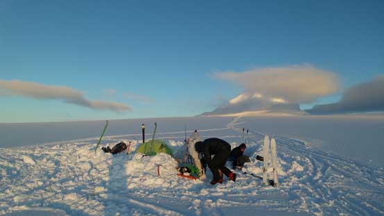 After a steep grind out of the trench our objective was soon back in view. And this time it’s finally getting bigger and bigger, though slowly.. Checking Ben’s GPS we still had more than 4 km horizontal distance but at just above a steeper roll we figured it’s already ‘good enough’ to drop our heavy packs and set up camp. The weather looked to be stable enough to allow a summit bid in the afternoon/evening so there’d be no need in carrying any farther. In addition to the sunshine, there was literally no wind which was certainly a bonus, making the camp set-up nice and pleasant. This was my first time camping on an icefield and also (surprisingly) my first time winter camping with ski gears… There were quite a lot of stuffs to learn from Ben and Vern and they both had camp’d on the Columbia multiple times and in bad weather. What actually shocked us was a sudden appearance of 4 snowmobiles over the horizon to the south… Before this trip I’d heard rumers that people sled all the way to the top of Snow Dome from Golden (via Bush Arm) and didn’t quite believe in that. But as of now I’d seen it personally so that has to be true. It took them less than 1 hour to sled to Snow Dome and back, but before going home they’d break a straight-line trail all the way to the base of East Face.