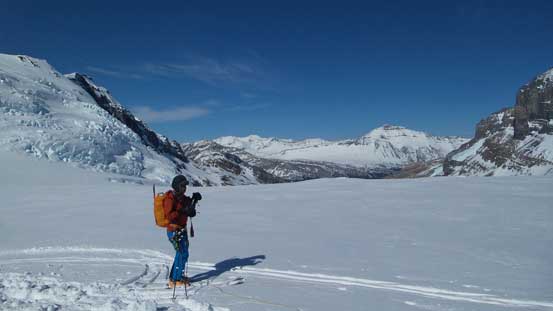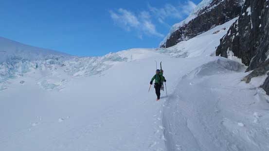 Ascending the first icefall went by uneventful but the second icefall looked to be a bit more broken than in the previous year. We took a short break beneath an obvious rock outcrop, roped up and decided to ascend a narrow snow arete between some ice chucks and crevasses straight ahead since the slope on far climber’s right looked to be narrow, steep and a bit too icy to skin up. Neither of us was in the mood of taking skis off at this time of the day yet.. The snow arete was a bit interesting but worked out perfectly and shortly after we were skinning across the ‘drop zone’ underneath Snow Dome’s house-sized seracs, trying to maintain a fast pace. The third icefall (the ramp) looked to be in a much better shape than in last year. It was a perfect ‘ramp’ this time with no open crevasse visible and I led the way basically straight up the middle of it.