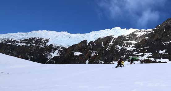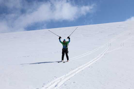 Me skiing down the Ramp. Lots of hazards here but we were glad to have good snow for a fun descent.