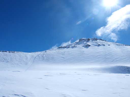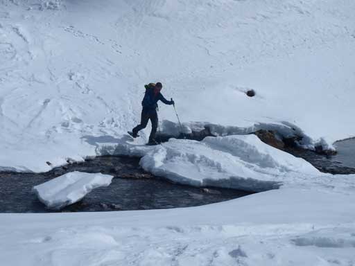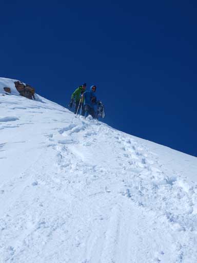 My line wasn’t fun since the snow wasn’t deep enough for snowshoes, and the ground beneath was still frozen and slippery. But I was the one finishing this part the first though. I had the concern that the “ramp” that leads down to the lower glacier could be a drop-off. I was getting nervous while approaching it since I still couldn’t see a “ramp” thing going down and the glacier just appeared to be much lower. Once I got there, I found it wasn’t a drop-off, but definitely steep enough to cause concerns, and if the snow was icy then we definitely would need crampons. It was frustrating so I waited for the other guys to show up. We searched further towards skier’s left, and Vern soon spotted a line down the steep band. Nice! By going left we also avoided some elevation loss and regain. This line was not as steep as the previous one I saw, but still very steep. We went down one at a time, and up the other side, we were on the glacier now.