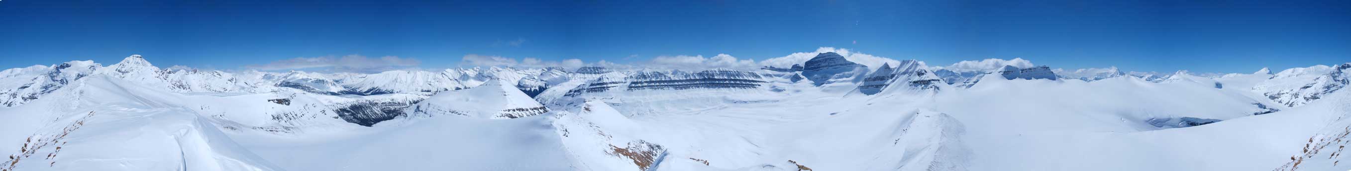 This glacier provides a short-cut way up Mt. Saskatchewan Junior compared to the route described in Nugara’s snowshoeing book. According to Eric’s photos taken in summer, this glacier, though small, does have some small crevasses and a big bergschund. Given the thick snowpack we thought it would be pretty safe to travel. One fact that applies to all glaciers is the foreshortened view. I knew Mt. Sask. Junior is higher in elevation than Big Bend Peak, so my strategy was to look back. Ben was apparently in a better shape than I did and he broke trail for most of the way up, and as we got closer we turned climber’s left and gained its east ridge, and then the view suddenly opened up. Despite the fact we just summitted Big Bend Peak a couple hours ago, we still got a “wow” moment here. Mt. Saskatchewan was just beyond impressive. I’d be happy to climb it someday and according to Eric it’s not overly difficult neither.