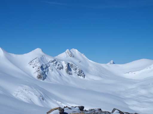 Mount Baker is the prominent one. Freshfield peaks at center in the background. Mount Forbes on right.