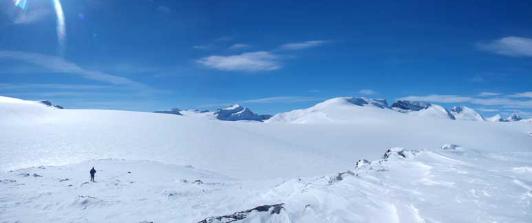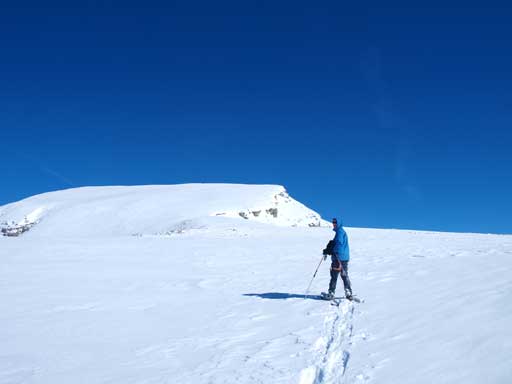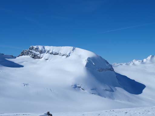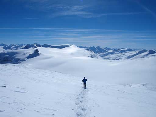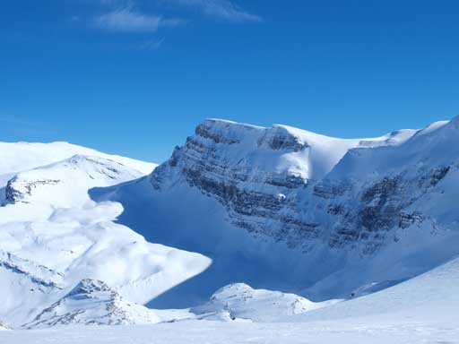 The base of Mt. Thompson’s west slopes appeared “right there”, but that’s a full cross of the Icefield, and that took us quite a while. Due to the fact we ditched gears too early, we didn’t have any down-hill advantage on this section. While travelling on flat terrain, you do really feel the work of trail-breaking, even though the penetration wasn’t that deep.. Since we’d just been up Mt. Rhondda, the best view from this section would be looking back at Rhondda, Habel, and Baker. In fact, the best view from Thompson’s entire slope minus the summit would be looking back at these Wapta Icefield peaks.