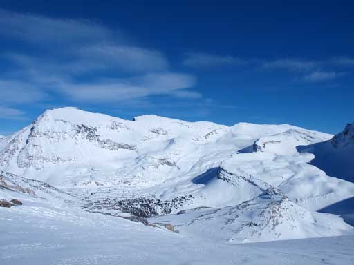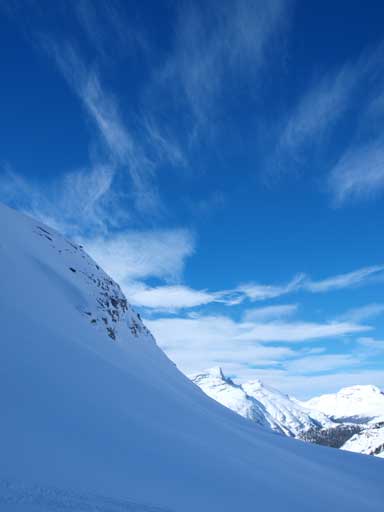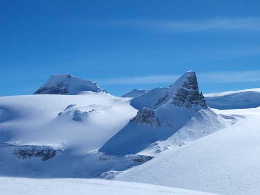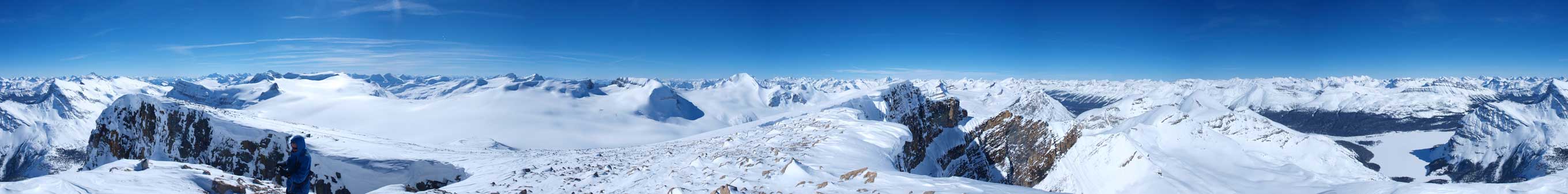 Again, instead of staying and soaking in the views, we immediately went down after taking summit photos. Plunging-step down the face was soft and fast, and in no time we made back to our backpacks, and then we were at the base. We roped up again. Looking towards the direction of Bow Hut, we immediately realized we had to lose some elevation dipping down to a very broad trench. The elevation regain was killing us, but even though we were exhausted, we could maintain a relatively fast pace at this stage. The cold wind eventually picked up, forcing us to keeping going. Ben hadn’t done The Onion yet, so we decided to grab it, because it’s only a 15 min diversion from our returning line. The view was also very different from my December ascent, with the sun at a much higher angle. Therefore I decided to go up there as well.