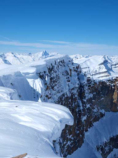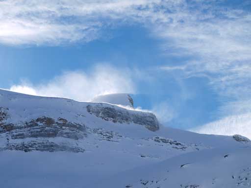Once at Thompson’s base, we ditched ice axe and some extra gears. The slope was definitely not scree as in the “normal” conditions, and we had to keep snowshoes on. The snow was deep enough so that foot travelling would mean knee-deep post-holing for 400 vertical meters. However, there did have quite a lot of rocks penetrating to or near the surface, and lots of scree bands to go over. This would probably the worst skiing terrain, but on snowshoes, it’s not bad at all. We both started to realize we were nearly running out of water. It was too hot on the Icefield and we had drink a lot. 1L was just not enough for these two peaks… My muffins would require lots of water to consume and I could only keeping up my energy by eating the bars. Ben had the same problem. Not far up we decided to ditch our backpacks to save some weight. We hadn’t even gone 1/4 of the way up at this point, but I must save that last bit of water for the return, so there would be no mean to keep my backpack on anyway. We shouldn’t be that exhausted given our fitness, but since we couldn’t eat and drink, we had to take a breathe for each 5-10 steps up… It felt like eternity, and I knew we had to get up higher than Portal Peak first, then St. Nick, then Vulture, and eventually we had to get higher than Rhondda… The ridge narrowed considerably partway up, and we were forced to stay on left side due to a massive cornice on climber’s right. After this bit, we were on the upper slope.