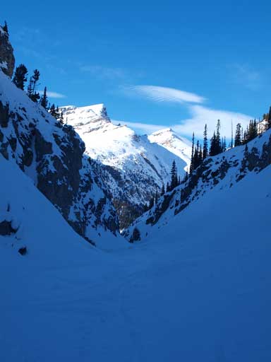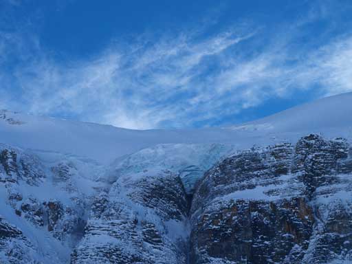 We plunged-down the headwall which was nice and fast and we were all eager to get some water from Bow Hut. We forced ourselves not sitting down because we still had a long way to go. I managed to eat my frozen muffin while drinking lots of water, and that rapidly boosted up my energy level to what it should have been. It still took us a while to get ready though, and once we were out again, we quickly followed the ski tracks down the last steep hill of the day. We got some really good clouds at this point which made us stopping regularly for photos. Since we did the approach completely in dark in the morning, the de-proach would be Ben’s first time seeing this route. We found a couple slabs and cracks on the canyon’s sides, with one nearly being released. Good thing it was a small one.