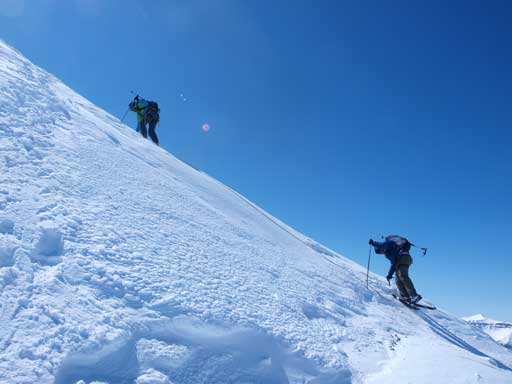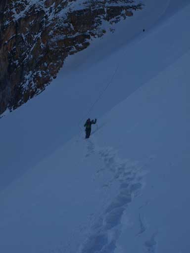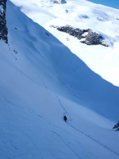 • South facing avalanche gully for 800 vertical meters, 30-35 degrees.