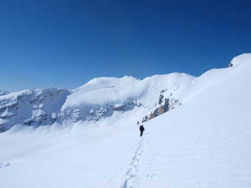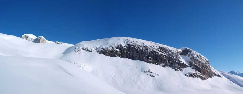 Leaning towards the north side, oh wow, looking at that slope! Even though we knew it’s a 40 degree slope we were still get surprised about how big the terrain on the other side. We took off snowshoes and walked down for as far as we could without too much post-holing, and then put snowshoes back on. There was no sign of any instability which was very good. We made a call to traverse skier’s left resisting losing elevation. We could save a lot of loss and regain on post-holing terrain. It was a good call because I’m writing the trip report at home, with the peak done, and no one got into trouble. However, I should say it wasn’t a smart call as the next 15 minutes or so would be extremely sketchy. With terrain-trap below any slide would be fatal. A beacon just wouldn’t help on something this big. There was also a couple slabs that were very hard so we had to count on snowshoe crampons. Slipping on those slabs would send us all the way down. Skiing here? Oh well. If I do Wilson again (which I don’t ever think so), I’ll be descending towards skier’s right and contouring around the obvious rock feature on its right side. You will be staying on the big slope for a longer time, but you won’t be doing the traverse part, but you will lose 100m more elevation. Overall there is no easy way here and every possible line is exposed to giant features.