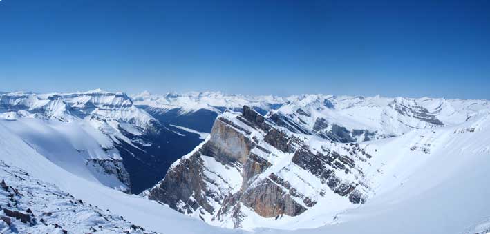 Some brightness started to show up on the horizon and looking back, we could see the impressive Mount Murchison. We were all psyched for the alpenglow that would be 1 hour or so later. Walking up consolidated snow on snowshoes was the best, and higher up we started to encounter avalanche debris that thankfully wasn’t entirely ice. We still could get grips on this snow boulders which helped a big time, because from here on until the top half of second gully, debris would be accompanying us all way. We soon found the supposed left fork, but it appeared to be too early. We made the call of going left after some debating, a good call. You’ll be going left on the first major branch. The right fork is still bigger, but left fork is considerably sizable too. You won’t see the upper gully looking left but that’s okay, and it will turn climber’s right not far up. We were glad to find about 30 centimeters of debris free line on the left side. And once we curved right the debris free line moved to the right hand side. Good luck skiers again. You’ll be walking up and down your skis while wearing boot crampons, kicking step into the hard debris… Once we hit the top half of second gully the debris were gone. We thought it would be only half an hour to the high col, but the view was very foreshortened. We were actually only about halfway up the second gully (starting from the fork). We kept looking back ready to shoot sexy ladies especially Chephren/White Pyramid. We didn’t want to just march up and miss the alpenglow. Once it started to glow, it was just beyond awesome. We entered crappy snow soon and just like on Fortune, we were slipping backwards. I made a call of switch-backing since it’s difficult for snowshoes to slip sideways. Ben and I took turn breaking trail up the last bit of the gully (with one section having slab avalanche concern), and once we made to the high col we got a head-on view of our objective, as well as how far we had to go down on the other side… We took our first energy break here.