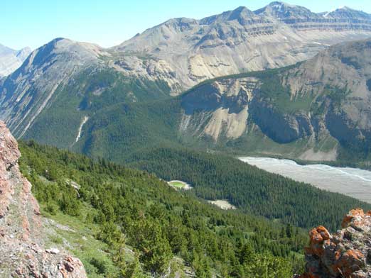 Panorama view of Mount Saskatchewan area. Big Bend Peak and Sask. Junior in foreground.