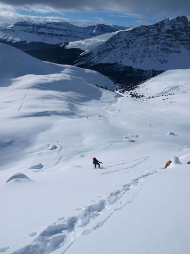 Wietse and I started our day by about 9 am from Mosquito Hostel parking lot. The approach along Mosquito Creek was exactly the same as what I did two days ago, and we made a good pace. Wietse was skiing, and I was on snowshoes. On the way in we passed Tyler Cassley’s group who also planned on Ramp Peak. That was encouraging as now we thought we gonna have 5 people breaking trail. In about 1 hour, we made to M5 campground. We immediately left the trail, and entered the forest, diagonally uphill towards climber’s left side. The trail breaking wasn’t too bad initially, but got worse and worse as we progressed upwards. Wietse’s skins couldn’t get a grip on the sugary bottomless snow, so I took turn packing down the trail. At least I had big teeth on my snowshoes which somehow helped. Eventually we made to treeline and our objective came in view. At this point Tyler’s group still didn’t catch us up so we thought they had already turned around..