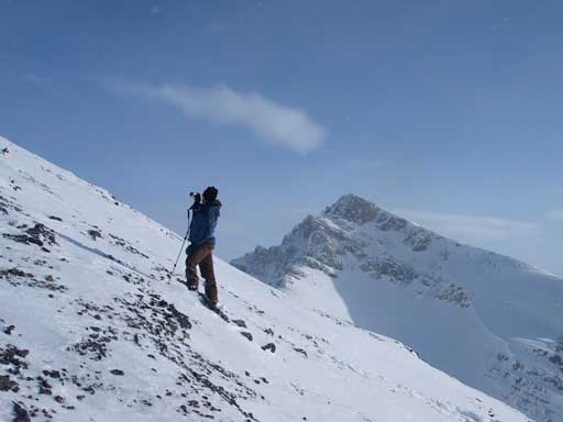 There were a couple of bumps on the way to Ramp Peak all requiring ascending steep unconsolidated slopes. The crux was to cross a very steep slope with a terrain trap below which was a bit nerve-wreaking to lead across. After this bit, over a few more bumps, we were at the base of the actual “Ramp”.
