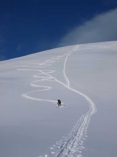 It was windy and cold on the top so I didn’t bother to wait, plus I was worrying about my descending speed. So I started the descent, and soon weather cleared up nicely… Wietse was about 10 minutes behind me so he must have got better view. Plunging step down the Ramp was much faster than expected and in no time I made back to the base. Now I could look back and take photos of Wietse skiing down this slope.
