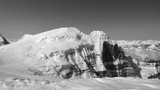 After a night of snow storm blizzard, we woke up under clear sky on the 2nd day of this expedition. As wished everybody was hoping to ascend the 4 Twins as early as we could but given the amount of fresh snow (at least 10 cm) and the gusting wind blowing all night long we decided it’s probably a safer choice to ascend the Stutfields and Cromwell first. To get either Stutfield NE or Mt. Cromwell one must ascend up and over the main summit of Stutfield Peak first, hence it’s the first peak bagged in this trip. We easily ski’d to Stutfield Col on some rolling terrain and from there on it’s nothing fancy. There’s one steep slope to ascend near a rocky band that I led a diagonal traversing line towards climber’s right, and after that it was an easy, albeit foreshortening slog up the gentle snow slope to the summit of my 21st 11,000er.