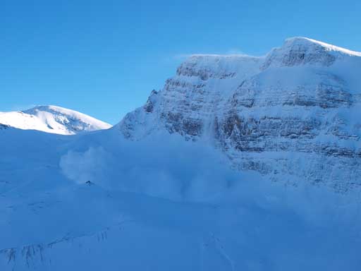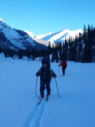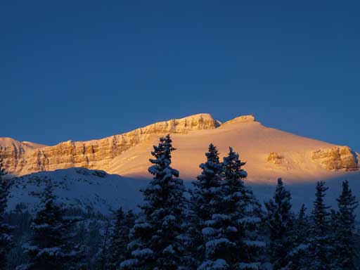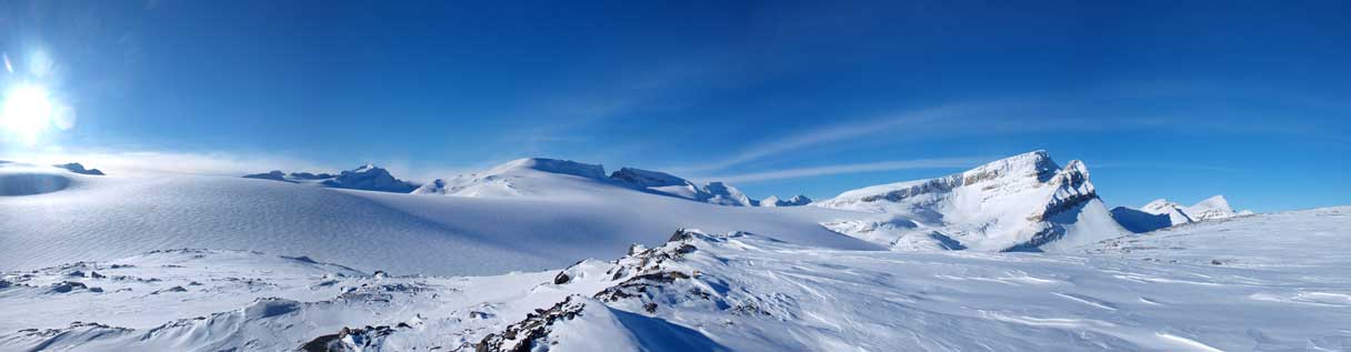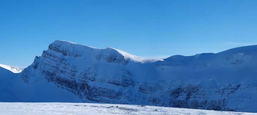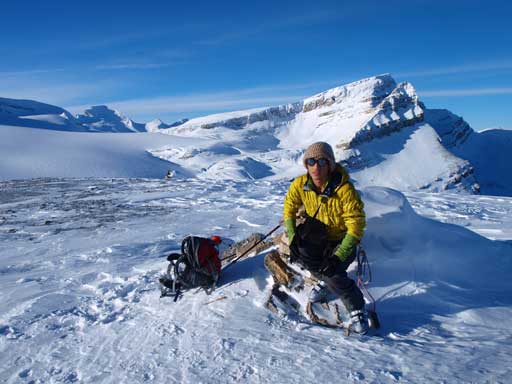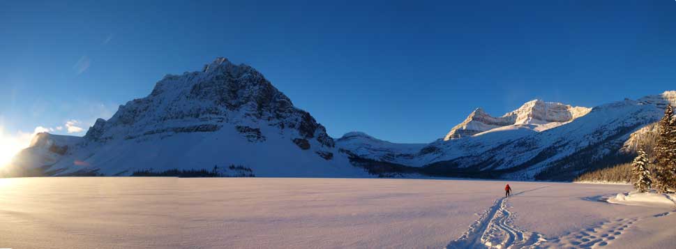I left Edmonton at around 9 pm Thursday evening and slept in car (-15 degree) at the Petro Can along Highway 1. The next morning we all squeezed into Bill’s Jeep and even with the snow tires and 4×4 the driving was painfully slow due to the fresh storm snow. Icefield Parkway was entirely snow covered and we knew we had lost some valuable time here even though everybody was trying to keep positive. The bright side was the better-than-expected weather – as we approaching Bow Lake it had turned bluebird! Eventually we managed to start skinning by around 9:40 am… Plodding across Bow Lake was a slog, but the view was awesome under morning light.