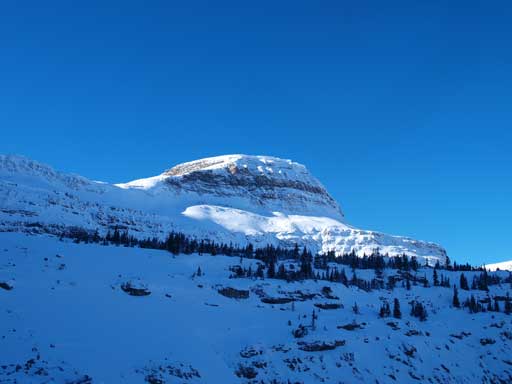 For us, the Bow Hut wasn’t an energy sucker, but definitely a time sucker… We spent about 40 min in the hut, and eventually it’s time to resume the ascent by about 2 pm. We only had a bit more than 2.5 hours daylight time. Bill had done Vulture Peak so it was only Kevin and I going up the headwall. We met Vern’s group coming back from Mt. Gordon, and after a bit of discussion, we figured we wouldn’t have enough time for Vulture Peak. Instead of attempting and failing, I pointed out the alternate objective, The Onion. There’s nothing to describe about The Onion, except we took off skis too early and ended up post-holing..