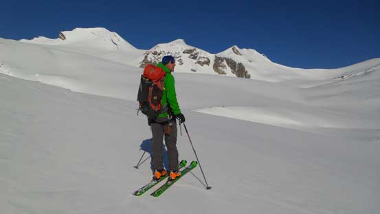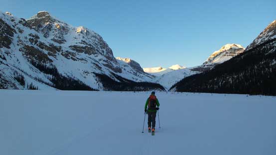 The view opened up widely once passing the research station, but it was also very disappointing to see the massive amount of elevation loss to the glacier. I think elevation loss is the theme of this approach. Those sections will drag on forever on the return so that’s probably why most folks don’t do Trapper or Baker as a day trip. The glacier was beautiful though. I love this one more than the glacier above Bow Hut. We skin’d uphill gently on the middle of the Peyto Glacier, and once up the ‘ramp’ we veered climber’s right towards our objective.