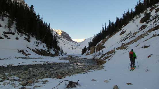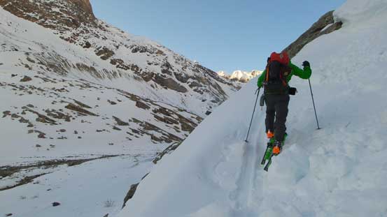 Towards the end of the flats there’s a short canyon with open water flowing. We followed the ski tracks staying on the right side. Thank to the icy condition we had to take the skis off briefly. After this bit the valley opened up again with the infamous moraine being straight ahead. The natural route would be following the creek bed/canyon, but that’s a very dangerous route (much more dangerous than Bow Hut’s canyon). The safer and more popular route is by going up and over the moraine. We skin’d as far as we could but eventually we still had to bootpack. It wasn’t because of the scree, but rather the icy condition. There was a ton of snow but getting up the icy slopes was difficult even with ski crampons and felt quite exposed.