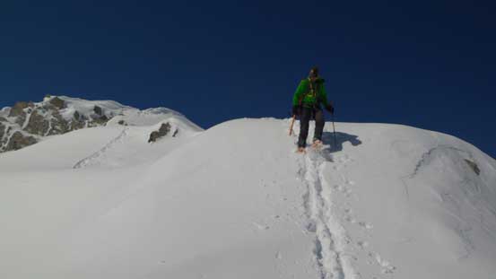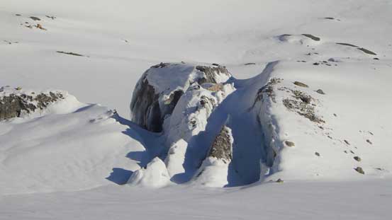 Ahead is the rock outcrop we had to bypass on this (south) side. So no matter what line we picked we still had to climb the steep slope.