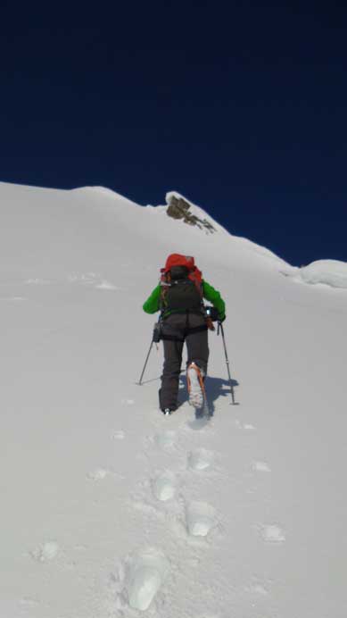 The only photo we took on the up-climb. We were speeding at the fastest we could. Here’s me traversing climber’s right to bypass a near vertical snow band. This traverse is extremely exposed.