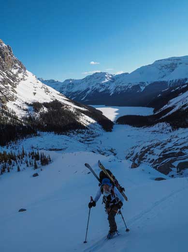 The Peyto Glacier approach is much more complicated than the Bow Hut approach. The first challenge was getting down to Peyto Lake from the parking lot. It sounded easy but for many people this is the most miserable part. We blindly followed some skiers’ tracks and ended up getting lost in steep bushy terrain. Bushwhacking on skis wasn’t fun at all and we wasted some valuable time here, but in any case it’s not a long way down to the lake so that was okay. The skiing across Peyto Lake was fast thank to the deep overnight freeze. It’s a long way across though…