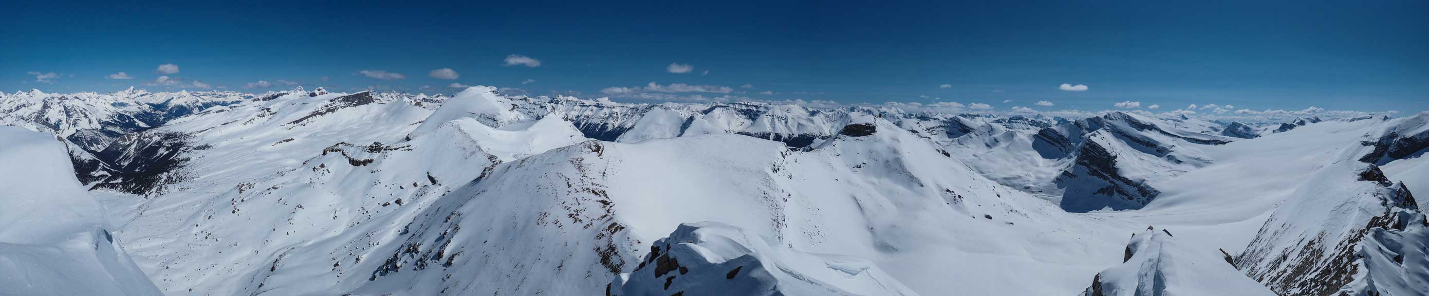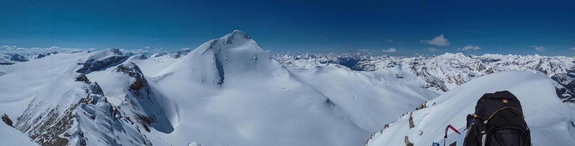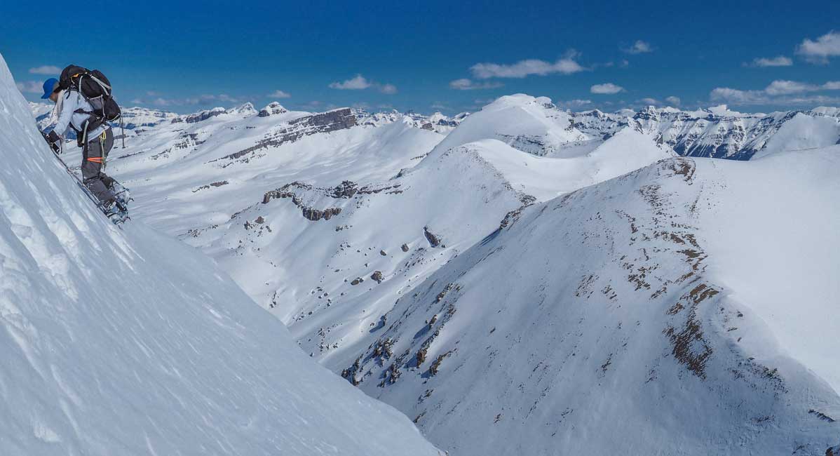 Though not nearly the biggest on the Wapta Icefield, Trapper Peak is certainly one of the trickiest climbs up there. To get there one has to climb a long and steep south facing slope that approaches 45-50 degrees near the top with a massive cornice hanging on climber’s right threatening the entire line, followed by climbing up a steep, corniced and exposed ridge with some exhilarating traverses on the north side. It’s certainly not for the faint of heart and deserves the same respect as Mount Collie and Ayesha Peak.