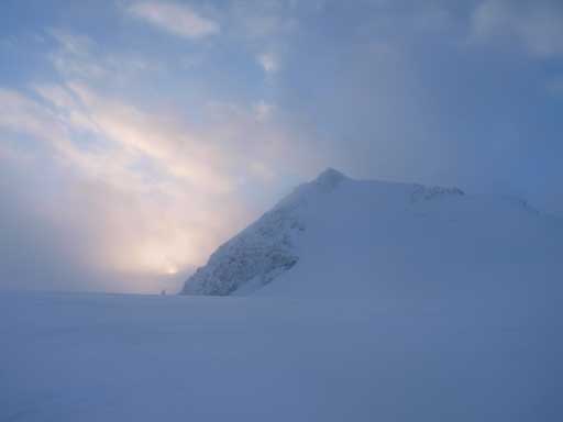 This was the second day of our “End of the world” Bow Hut ski trip (did The Onion on the first day). The 6 am alarm woke us up and looking through the windows revealed some bad news… Instead of “a mix of sun and clouds” as predicted by the weather forecast it was snowing. Maybe the world did end… However, we could see the outline of Crowfoot Mountain so the visibility wasn’t too bad. At this point I was still optimistic about our primary objective, Mt. Olive. And long story short, after breakfast, we left the Hut at 7:20 am. With headlamps on, we started marching up the headwall. It was dark, snowy, but not windy. After what seemed like a long time, it started to get brighter, but there was no sign of improvement in the weather. Our confidence level got lower and lower, and eventually our group members started to bail out one by one, and eventually it was only Kevin and I marching up the glacier. It wasn’t a total white-out and we could see St. Nicolas Peak so we kept going.
