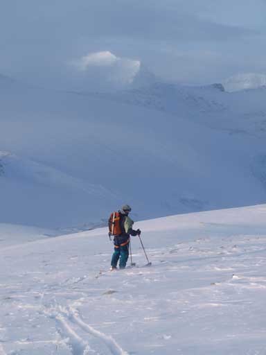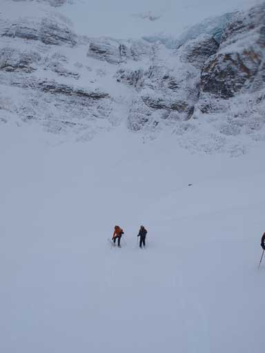 Slogging back up the St.Nick/Olive col was boring but at least didn’t take too long. We had a brief discussion whether attempting Mt. Olive or not. Again, given the unpredictable weather we voted for no, and we were right. Once back at the col, the weather closed in again. We also couldn’t figure out where we went up as the tracks were covered, but we had to get down anyway, so we took off the skins, and picked a direct line down the col. The rest of the way down was so fast, 5 times faster than snowshoeing.. Too bad the slope down the headwall wasn’t all fresh powder (thanks to Vern, Kelly, Bill, and Wietse), and those ski tracks created some challenge to me. I did two face plants due to the unexpected “bumps”… Falling on soft snow wasn’t hurt anyway and it was pretty fun.