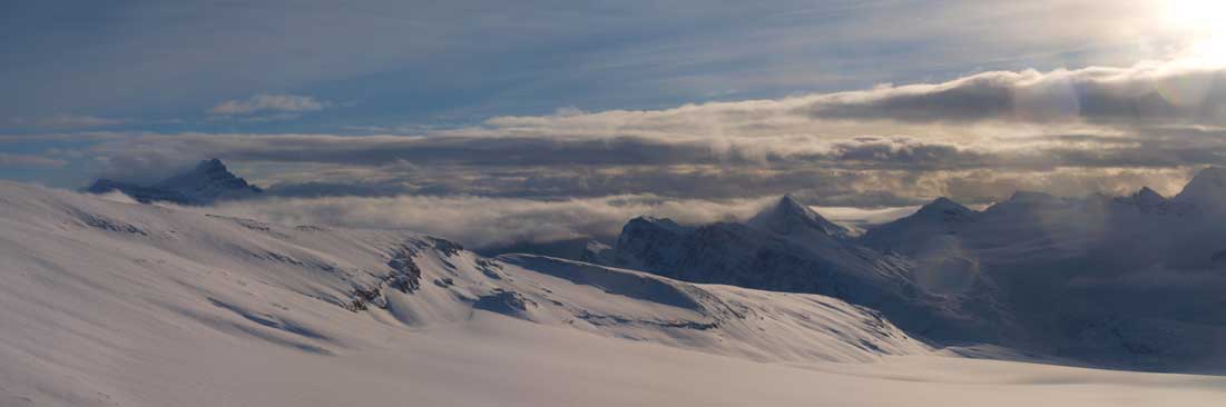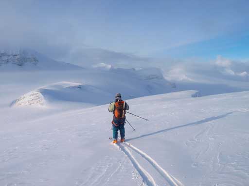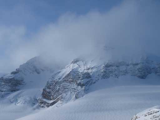 Nobody said anything and we kept moving on Vulture Glacier, and 2 min later, we finally could see Vulture Peak. It looked quite far away though. We went straight towards the peak over a small bump. This section was mainly down-hill and on since we were skiing, it took us no time to arrive at the base of the final slope. It’s a tedious plod, but we did manage to skin all the way to the summit, and meanwhile, some blue colour started to show up above us, and then Thompson, Olive, Balfour, Crowfoot, and eventually, Collie, Baker and Hector! Wow, given the weather we felt like stealing something!