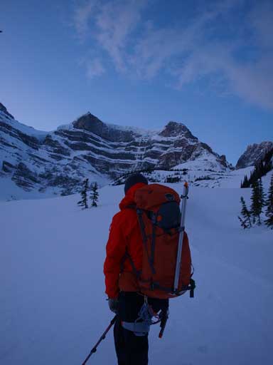 The ski tracks traversed more towards climber’s right and were very easy to follow. They looked to be fresh. However, we didn’t get enough freeze overnight, and we punched down quite a few weak areas and snow bridges. We had to stay on track, otherwise it would be an exhausting game of post-holing. The creek bed, just like Hector Creek, was not steep enough for heal-lift, but steep enough to make my legs sore. It didn’t take us long to reach Epaulette Lake, which was larger than I thought. There was some open water near the creek side. The valley on the other side of Epaulette Lake was also much longer than expected. It took us a while to the base of the steep ascent gully. By this time the sky was getting brighter. It was apparently gonna be a windy day, and I had to take out my jacket.