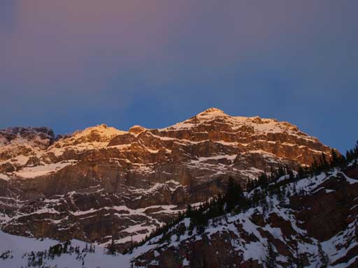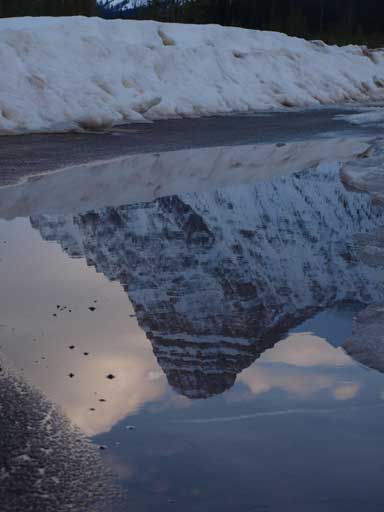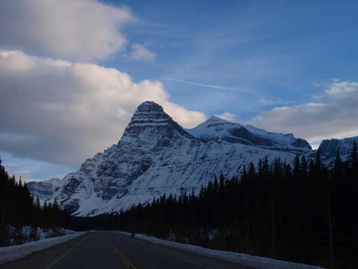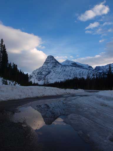 Given the great condition and weather in this Easter Weekend, we wouldn’t be satisfied by just Mt. Hector.. Mike and I would be accompanied by Wil Tabak on this day. The avalanche condition would drop to “Moderate/Low/Low”, and weather would be partly cloudy instead of variable cloudiness. White Pyramid, although still a very big mountain, would be easier than Mt. Hector since it doesn’t have the rock step challenge. Its standard route is a mere snow plod in the ‘right’ conditions. We figured that the crux would be locating trail-head in dark, the potential of river fording, and negotiating the creek bed if not being broken.