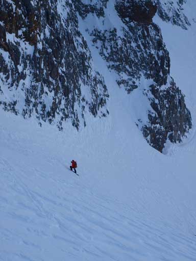 It was very cold and windy so we didn’t stay long. Actually the wind picked up considerably in the afternoon, and our entire descent was hammered by the cold wind, especially on the ridge. We met two groups of skiers on their way up. Well, I guess there’re people being more confident on the snow condition than us. The place where we ditched our shoes was one of the few wind sheltered area, and we had a quick lunch break. We kept our ice axe and crampons on, while carrying snowshoes, down that steep slope. Like I said before, it’s a real slope. It’s steep enough that I would never consider skiing it with my current ski skill.