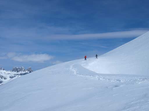 The grade eased after topping above this head-wall. This was an excellent place to take a break. The gully was actually flatter than expected. It steeps a bit, and then flats out, and repeats the cycle, until we were near the end, where we should turn left towards the summit ridge. We resisted the urge of going up too early according to Vern’s trip report, and kept following the gully to its end. Here the terrain was too steep even for snowshoeing. I didn’t see boot tracks and I certainly didn’t want to take off snowshoes and post-holed knee deep. Instead, I awkwardly made some switch-backs and eventually made to the ridge. This is a big slope, one of the biggest I’ve ever been on. Mike took out his ice axe for some security which was a smarter idea.