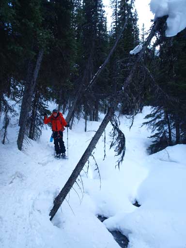 With Mt. Hector knocked off already, I could sleep well on Friday night not thinking/worrying too much about White Pyramid. We woke up at 3:30 am, had some breakfast, drove north, parked at a small pull-out slight further than the supposed trail-head, geared up and started at about 5:30 am. This is a longer drive than Mt. Hector. We drove separately since Mike and I would go home from Highway 11 instead of Highway 1. We kept our eyes closely on any visible ski tracks, and we soon found one on Bison Creek. That wasn’t the way to go, so we kept walking south. Mike found another set of tracks about 10 min into the walk, and we decided to follow that. Well, I have to say, there would be multiple routes to Epaulette Creek in that general area. It really doesn’t matter especially on snowshoes. The tracks we followed crossed the Mistaya River three times, so you might want to choose another one if river fording is required. For us, the river was well frozen and we could walk across the solid ice/snow.