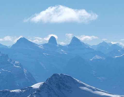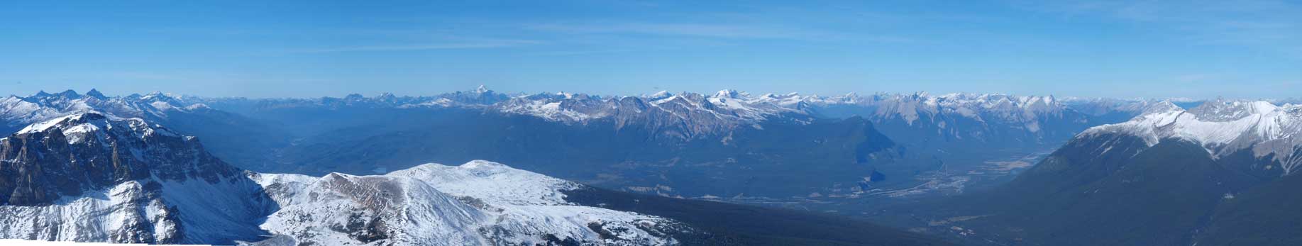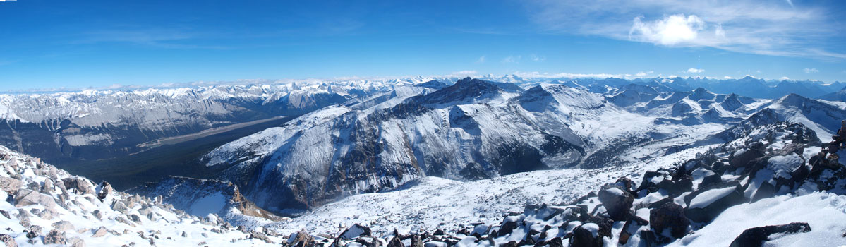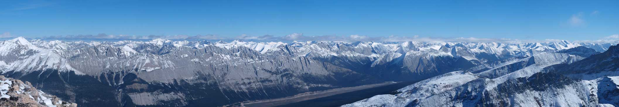 Panorama of Victoria Cross Range across Athabasca Valley. Mount Robson is visible.