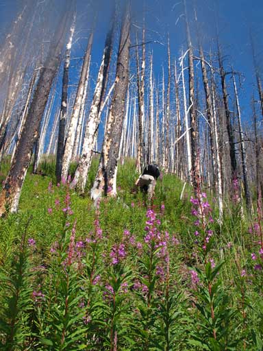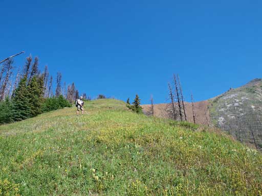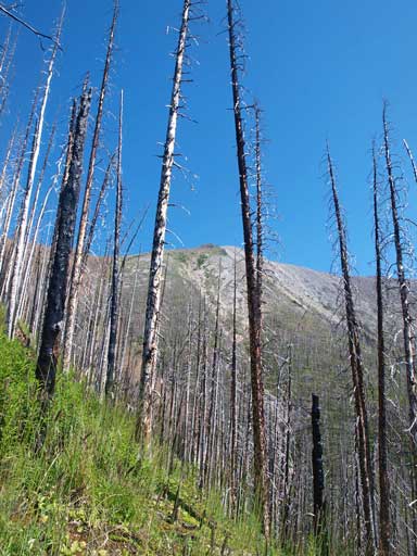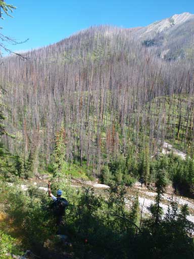 The trail indeed continued down that side and we didn’t have to bushwhack until dropping down to Cumnock/De Smet pass. The trail curved left around Redan so we bailed down to the creek that runs through the pass between Roche De Smet and Mount Cumnock. The water level was low in August and we didn’t even need to ford this creek. There was a couple logs providing natural bridges. The other side was burnt forest, so really, there wasn’t that much bushwhacking at all. Don’t get me wrong though as it’s still in the bush. But assuming you’ve done other Jasper styled bushwhacking ascents like Boule Roche, you’ll find this one being quite pleasant. The beginning part of this burnt forest was tedious due to the deadfalls but higher up it was a pleasant hike with pleasant views all around.