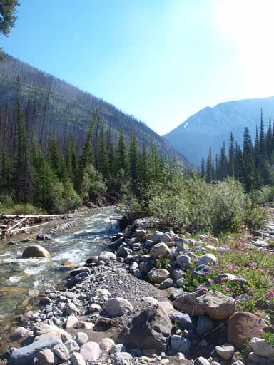 Looking north up the Snake Indian Valley. In the distance at center is Persimmon Range and Daybreak Peak