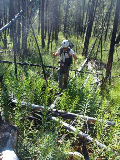 Ben hiking on the overgrown trail. Believe me or not the trail is not hard to follow...