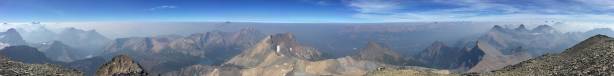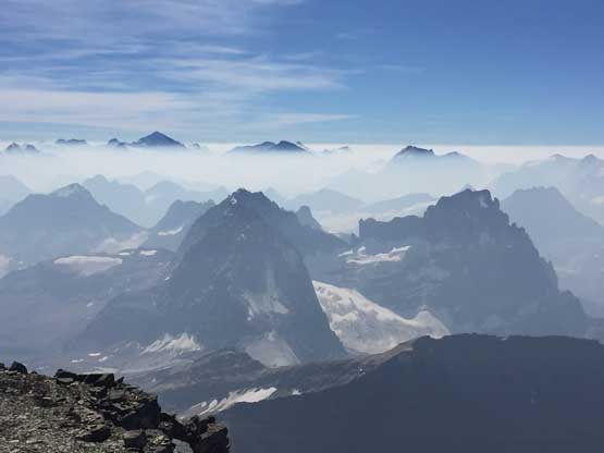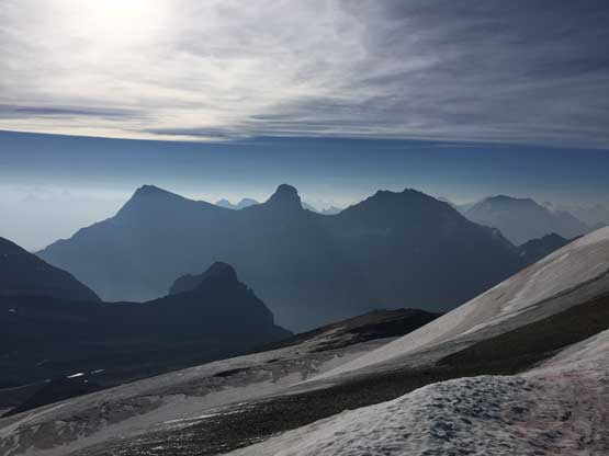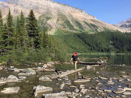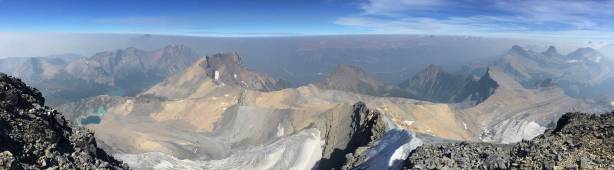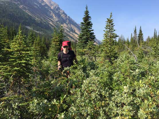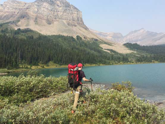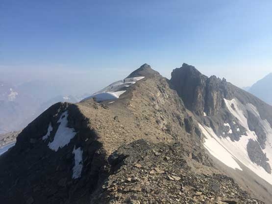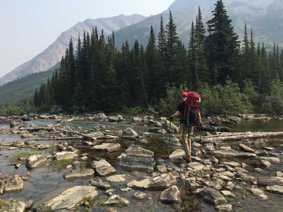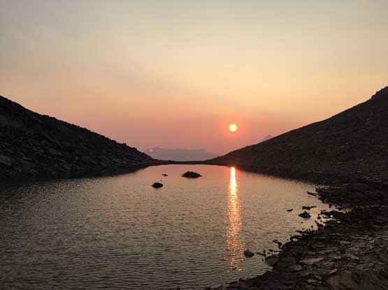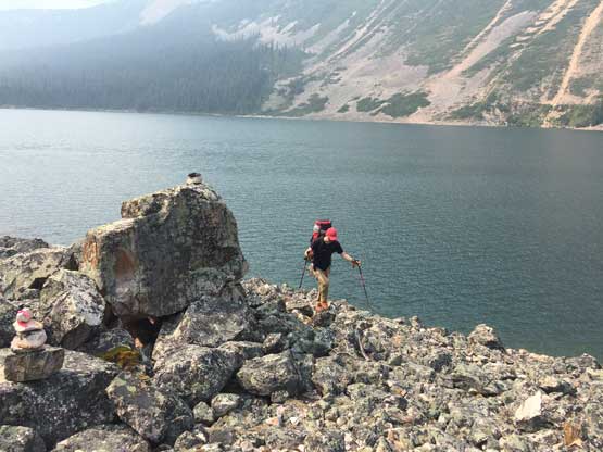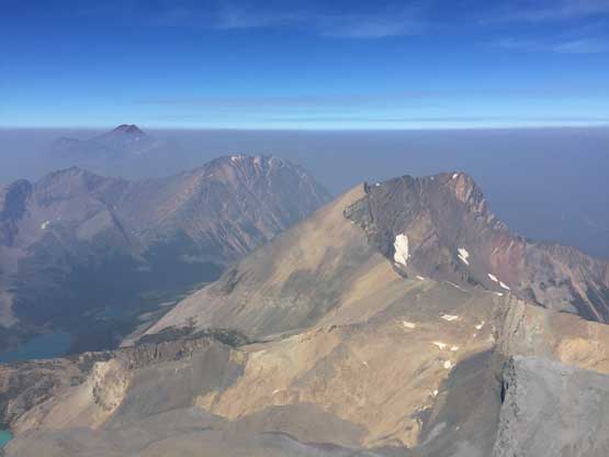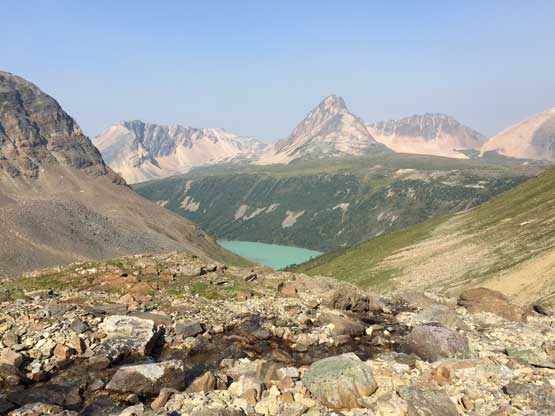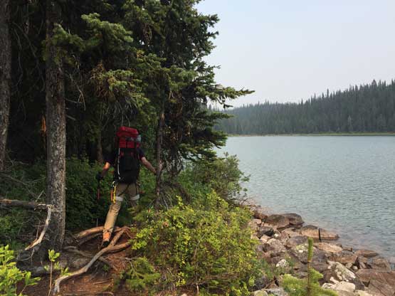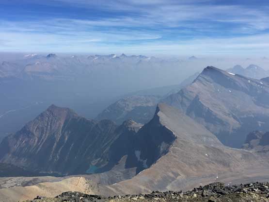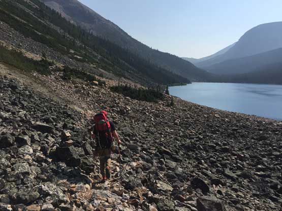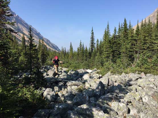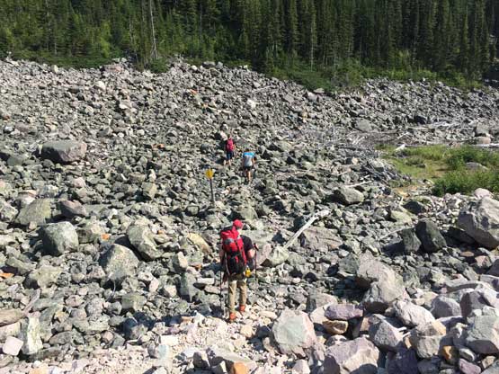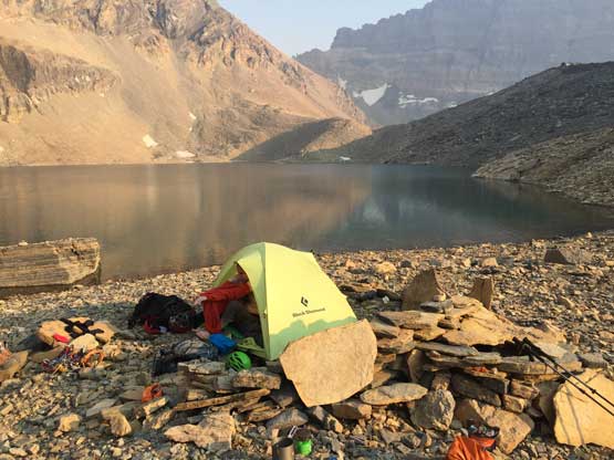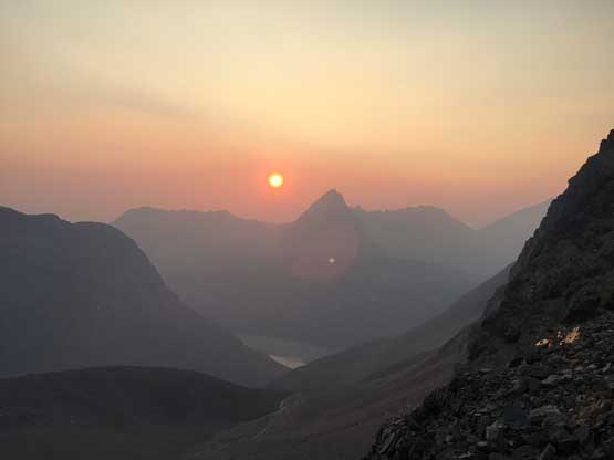 The approach via Geraldine Lakes is well known for its beautiful scenery. We did not even have the clearest skies due to the wildfire smoke but even that I had to agree with everyone else. We passed four large lakes with each of them prettier than the previous one and towards the two upper lakes we had the sight of this majestic Mt. Fryatt dominating in front. It’s hard to believe that’s what we would climb on the following day. The bad aspect about this approach is the endless boulder fields, muddy trail and some degree of “on-trail bushwhacking”. The boulders are all quartzite so it’s crucial to do this approach in dry conditions. I actually found the boulders quite fun probably because of the three years experience mountaineering in the coastal ranges’ blocky granite terrain. The mud and bush along this trail was annoying at times but it’s nothing if you come from the “wild west” – the British Columbia’s Coast Mountains.